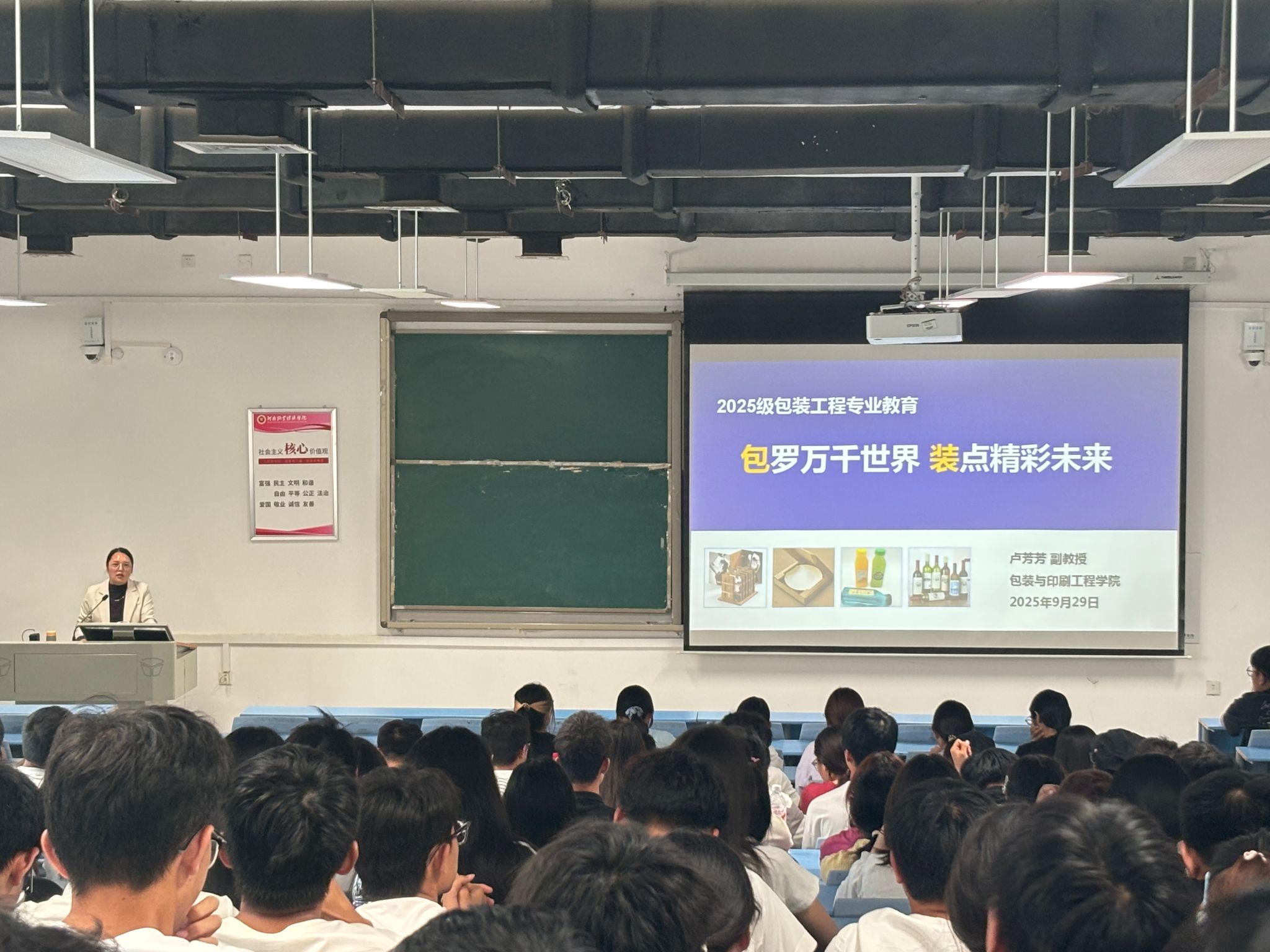 讲座上,卢芳芳以《包罗万千世界 装点精彩未来》为题,聚焦包装工程专业,从专业内涵、主修课程、师资团队、发展前景和部分案例五个方面进行了详细讲解。针对包装工程的专业内涵,她强调,包装设计不仅是外观的美化,更是品牌理念、产品特性和消费者心理的综合体现。期间,卢老师围绕本专业的核心课程体系,并结合着大家感兴趣的问题对包装工程的专业课程设置、培养目标、就业前景以及优秀毕业生的个人经历等内容进行介绍,激发学生对包装专业的热爱,让在座的新生更加明确了在大学期间的目标和努力方向,鼓励他们勇于探索、不断突破。