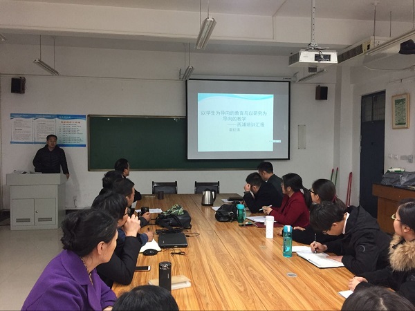 苗红涛和宋卫生老师结合生动、详实的案例,通过摆事实、讲道理、正反对比、分析综合、归纳演绎等论证方式讲明了教改的观点与主张、态度与立场。苗老师主要从什么是研究导向型教学、为什么要实施研究导向型教学以及如何构建研究导向型教学模式等方面,同大家分享学习心得与体会。期间,苗老师指出:研究型导向教学旨在培养学生的交流沟通、主动学习、团队合作等研究型能力以及批判思维和创新思维,主张改变打破以教师为中心的传统教学模式,倡导以学生为中心的教学方法;要通过问题驱动和教师引导,努力为学生营造良好的学习情景;要善于指导学生形成团队、整合知识,群策群力共同解决问题。宋老师从“以经验反思和行动研究为抓手,以大学和中小学双导师为依托,以调研报告、教学设计为内容,以学生、教师多方评价为标准”以及相关支撑等方面,讲解了“实习与论文一体化”的教改思路与方法。同时,宋老师深刻分析了校企联合指导毕业设计实施中现存的七个方面的问题,并结合密执根州立大学包装工程专业的毕业设计的经验和做法,分享了在以学生为中心教学理念为指导下的课改心得与体会。