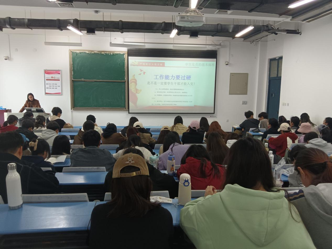 孟星星首先向同学们讲述了入党的基本要求和准则,解释了“什么是入党动机”,并就“你的入党动机是什么”这一问题与同学们展开深入探讨,希望每位同学牢记党的最高理想和、最高目标及党的根本宗旨,端正入党动机,按照党员标准严格要求自己,严格履行入党手续,时刻保持党员的先进性和纯洁性,做到为实现共产主义事业添砖加瓦。接下来,孟星星向同学们详细讲述了入党的流程,要求各入党积极分子要自觉接受党组织的培养和教育,主动向党组织汇报思想、工作和学习情况,在实践中不断用切身体验来深化对党的认识。