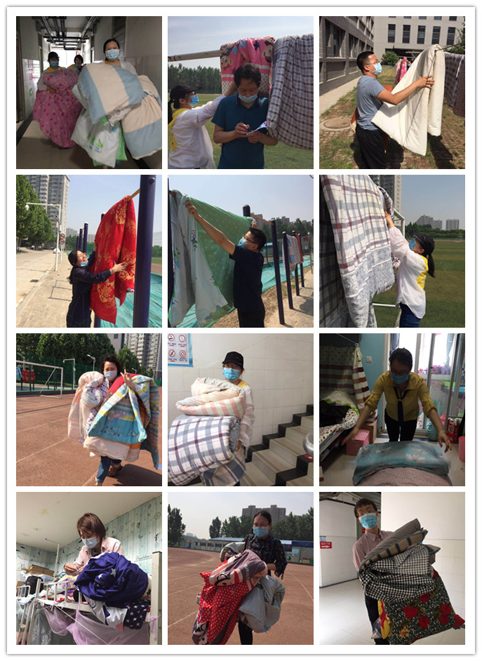 为了让学生有平安宁静的学习环境,院领导亲自带领全体教师为学生打扫教室和实验室,安排好个性化的心理舒缓室、专门考研复试室、应聘面试室;为了让学生有舒适安心的生活环境,全体教师为即将返校的74名学生晾晒被褥,从编号,搬运,翻面,再到收回,老师们细致入微,确保每条被褥都接收到充足阳光,并为每个宿舍摆放提前准备的绿植和消毒洗手液;为了以最简便而又不失温馨的方式提醒学生做好返校后的健康管理,为每位学生做温馨提示卡……