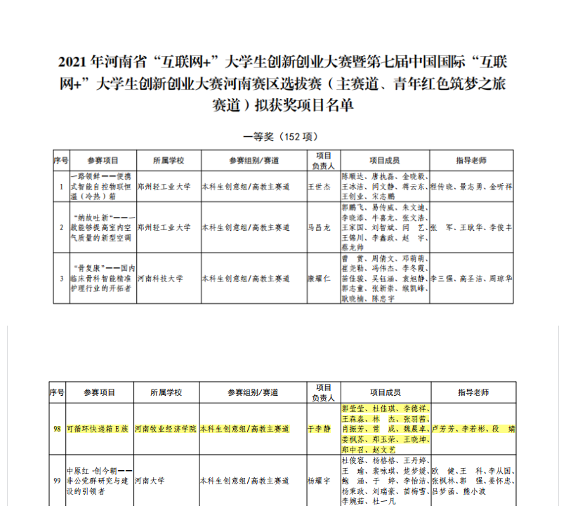 近日,省教育厅公布了2021年河南省“互联网+”大学生创新创业大赛暨第七届中国国际“互联网+”大学生创新创业大赛河南赛区选拔赛(主赛道、青年红色筑梦之旅赛道)获奖名单,由太阳集团城娱8722和弘雅书院共同指导的参赛项目《可循环快递箱E族》获得高教主赛道一等奖,实现该赛事获奖的新突破。