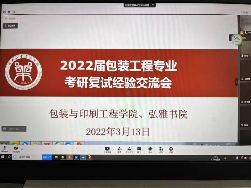 近日,全国研究生入学考试成绩陆续公布,为帮助考研毕业生更好地准备复试,提高考研复试成功率,从而获得更广阔的发展空间,我院联合弘雅书院于3月13日在腾讯会议开展2022年包装工程专业复试交流会。会议邀请上届成功上岸的五位优秀校友分享复试经验。太阳集团城娱8722院长张岩、教科研主任苗红涛、弘雅书院团委副书记段婧出席,2022届考研毕业生参加。交流会由包装工程教研室主任卢芳芳主持。