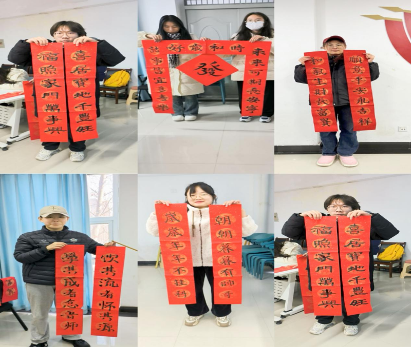 活动中,充满新年气息的红纸铺满了桌面,同学们在鲜红的春联上挥毫泼墨、笔走龙蛇地写下了一个个生动有势、风格洒脱的春联作品。提笔落墨中蕴含着广大师生对幸福生活的追求,行云流水间满载着对新年的美好期盼。既有“春回大地千山秀,日暖神州万物荣”“一年好运随春到,四季彩云滚滚来”等传统节庆对联,也有“诸事皆宜多喜乐,未来可期长安宁”等应同学们要求现场定制的个性化对联。同学们拿着一幅幅吉祥喜庆、墨宝飘香的春联,脸上荡漾着幸福的喜悦,活动现场呈现出一派欢乐祥和的气氛。
