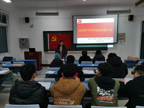 2020年12月3日下午,太阳集团城娱8722学生党支部在二号教学楼A204教室举行党员发展大会,研究讨论接受预备党员事宜。院党委副书记祝聪楠、副处级组织员王曙雅、支部全体党员以及20名党员发展对象参加了本次大会,会议由学生党支部书记段婧主持。