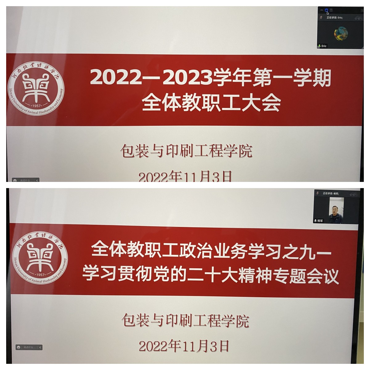 为深入学习和领会党的二十大精神,11月3日下午,学院党委以线上会议的形式举行我院第九次教职工政治业务学习活动。本次学习主题为“学习贯彻党的二十大精神”,由学院党委书记杨军同志主持,院长张岩和副院长苗红涛领学,学院全体教职工参加。