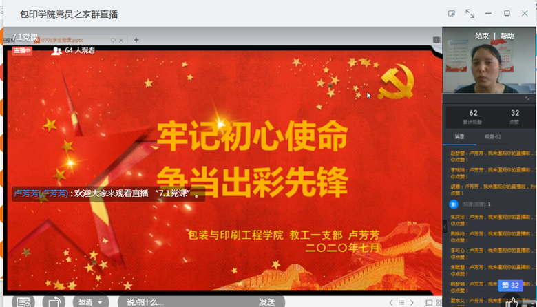 在建党99周年到来之际,为加强我院学生党支部与教工党支部的共同建设,引导广大党员在深入学习领会党的创新理论中筑牢信仰之基,我院于7月1日下午开展了“党支部书记开讲了”主题党课活动,教工第一党支部书记卢芳芳老师以《牢记初心使命、争当出彩先锋》为主题进行主讲。我院学生党支部全体党员和入党积极分子通过钉钉群直播进行了全程聆听和学习。