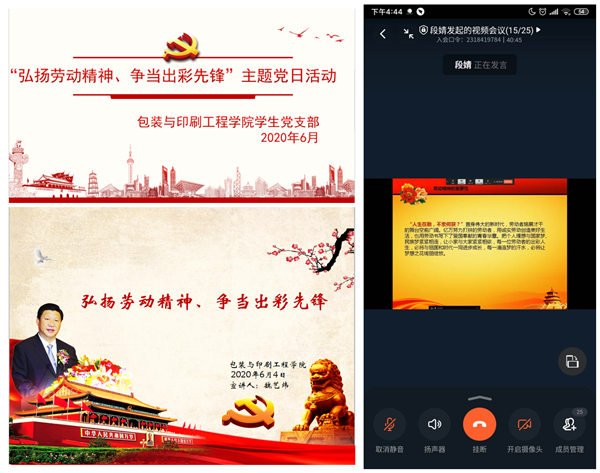 之后16级包装工程01李璐瑶、16级包装工程02李展和16级包装工程03班魏艺玮三名党员以“弘扬劳动精神、争当出彩先锋”为主题开展了微党课活动,大家从对劳动精神的理解、疫情中的劳动精神、“战役”事迹的感想收获等几个方面进行了精彩分享,大家纷纷表示将用用诚实劳动创造美好生活,用劳动书写下了爱国奉献的青春华章,把个人理想与国家梦、民族梦紧紧相连,与祖国和时代一同进步成长,用每一滴追梦的汗水,滋养梦想之花绚丽绽放!