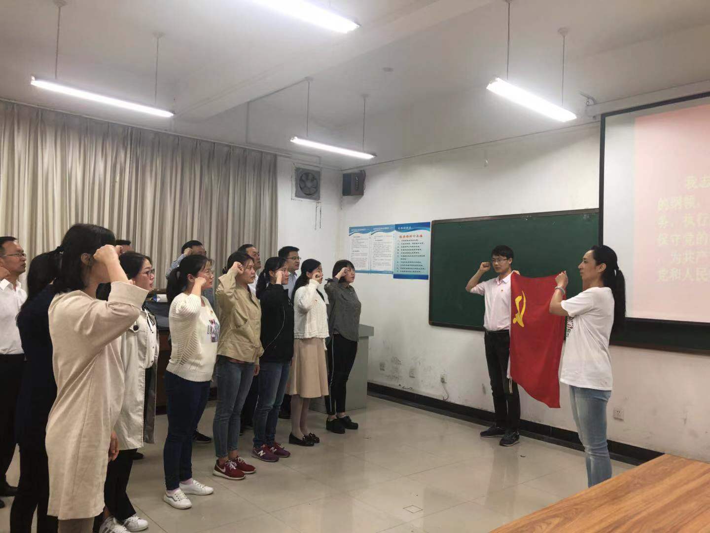 动员会后,党员教师面对党旗、举起右手,再次重温入党誓词,对党做出庄严宣誓。大家作为党员的荣誉感、使命感及对组织的认同感、归属感倍增,为共产主义奋斗终身的责任心、实现伟大中国梦的自信心和决心进一步坚定。