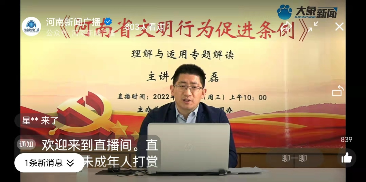 在前期收看郑州大学法学院副教授郑磊《河南省文明行为促进条例》专题讲座的基础上,杨书记又带领大家集中学习《河南省文明行为促进条例》全文,向大家讲解条例中文明出行、爱护公共环境卫生、拒绝高空抛物等与生活息息相关文明行为要求;对《条例》的法律规范以及不文明行为的处罚措施等内容进行分析,帮助全院教职工确立日常行为中的文明规范,引导大家树立文明观念、展示文明形象,用实际行动带动和感染身边群众,共创文明美好生活。