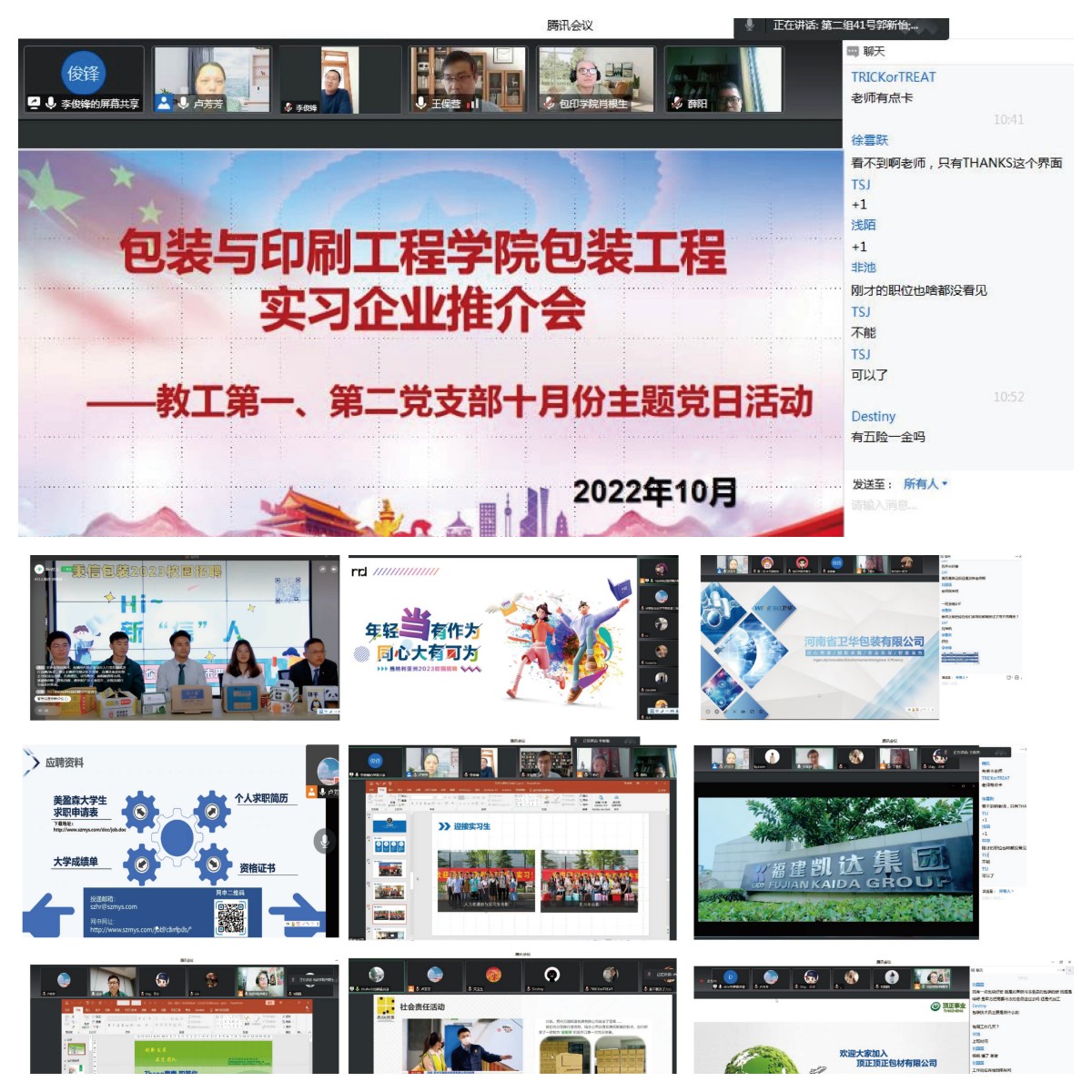习近平总书记在党的二十大报告中指出:“必须坚持在发展中保障和改善民生,鼓励共同奋斗创造美好生活,不断实现人民对美好生活的向往”。就业是最大的民生,为提前帮扶学生做好实习、就业工作,在院党委的指导下,我院教工第一、第二党支部联合开展“党员先锋齐上阵 就业实习齐帮扶”主题党日活动,该活动历时1周,共举办了2场简历制作及工作经验交流会,5场企业实习就业宣讲会,服务了11家包装企业和百余名学生。