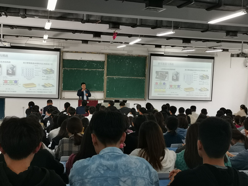 讲座上,刘旭影教授从研究的背景与挑战、金纳米颗粒电子油墨及其在OTFT应用、全印刷制备高可靠性OTFT与性能评价、高分辨电子工艺及其在OTFT应用、其他类型金属纳米颗粒电子油墨等五个方面,向大家讲解了高分辨全印刷柔性薄膜晶体管阵列技术与应用和印刷替代光刻技术制作薄膜晶体管的新技术,详细诠释TFT结构及其薄膜沉积技术以及全印刷制备TFT阵列在材料、工艺、面三个方面的挑战。随后,刘教授与现场同学们进行了热烈的互动,对同学们提出的问题进行了一一解答,并围绕考研对同学们进行了具体详细地指导,他指出要树立适合自己的学习目标、养成良好习惯、合理调整心态,并强调提升英语水平、具备演讲能力、掌握处理图像的技能、明确具体成长目标是本专业研究生阶段的四大法宝,希望大家在学习过程中,抓住重点,确定目标,努力奋斗,不负青春!