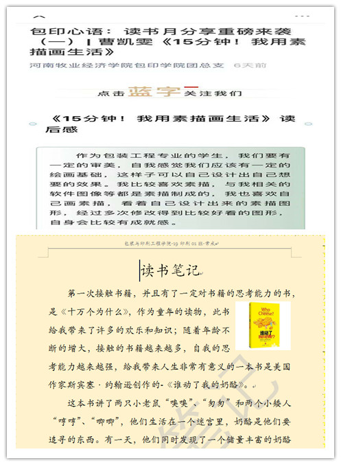 读书月期间,各班同学积极参与,争相撰写提交阅读心得,学院根据读书和撰写阅读心得体会情况评选出学院的“阅读之星”给予了表彰,并选取其中的优秀读后感在我院公众号上进行了推送,帮助我院学子养成与书为伴热爱读书的良好习惯,在全院学生中营造出了良好的阅读氛围。
