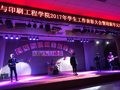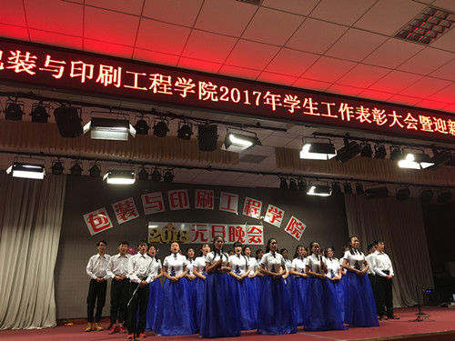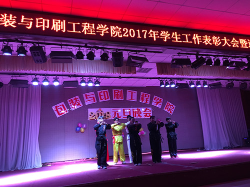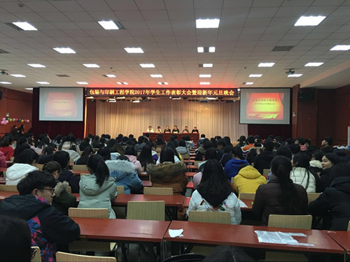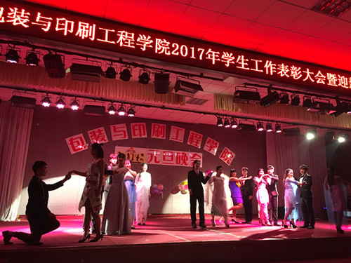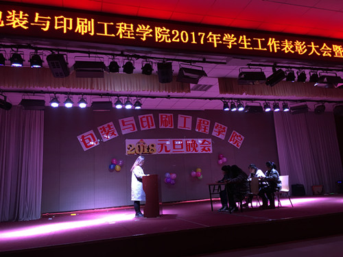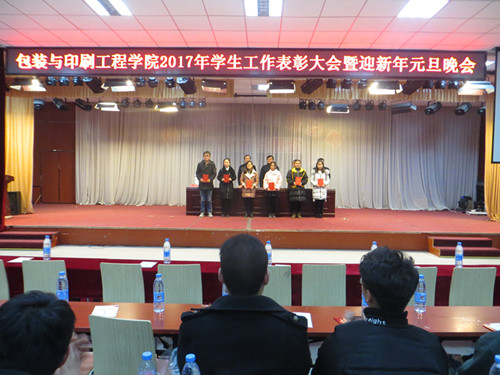 为表彰先进、树立典型,迎接新一年的到来,太阳集团城娱8722于2017年12月25日晚在大学生活动中心举行2017年学生工作表彰大会暨迎新年元旦联欢晚会。包装印刷工程学院院长魏庆葆、院党总支书记崔永、副院长李自刚、院办公室主任郑高锋、院包装教研室主任刘士伟及我院辅导员老师都参加了此次活动。