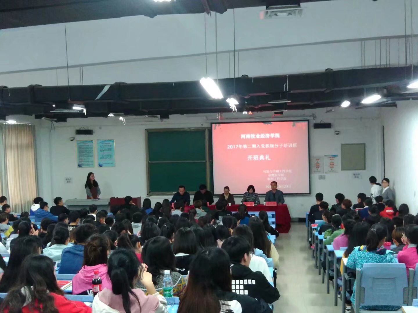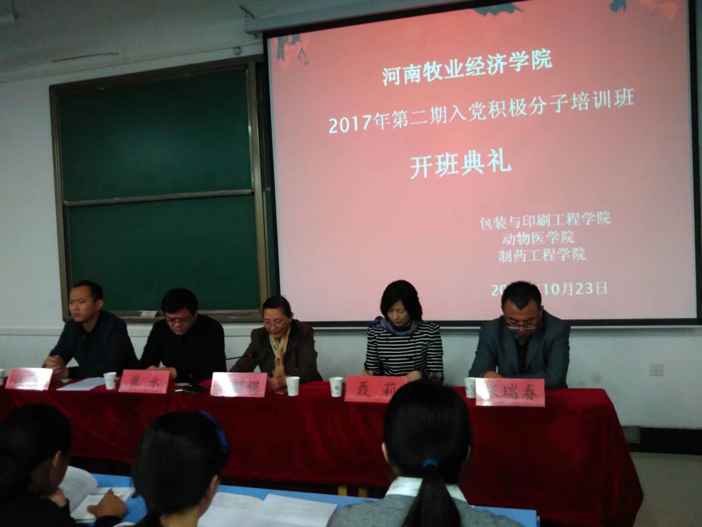 10月23日由太阳集团城娱8722、制药工程学院、动物医学院党总支联合举办的2017年第二期入党积极分子培训班在1号教学楼合501进行党课开班典礼,太阳集团城娱8722党总支书记崔永、副书记聂莉、制药工程学院党总支书记杜鹏娟、动物医学院党总支副书记张瑞峰以及三个院系的团总支书记、辅导员和全体学员出席了开班典礼。制药工程学院党总支副书记汪洋主持典礼。