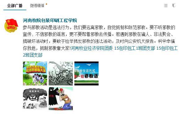 通过观看反邪教视频,团课集中学习,各班同学认真撰写了观后感。同学们表示,参与邪教活动是违法行为,我们要远离邪教,自觉抵制和防范邪教。要不听邪教的宣传,不信邪教的谣言,更不要帮着邪教去传播。若遇到邪教在骗人、非法聚会、搞破坏活动时,要敢于检举揭发邪教的违法活动,及时向公安机关报告。14级印刷班的周济慈同学也表示作为一名光荣的共青团员,不能对宗教进行盲目崇拜,应当始终坚持马克思主义,辩证地看待宗教信仰问题。