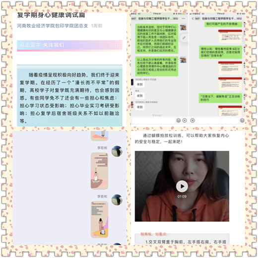 在学生居家学习阶段至复学归来,充分利用学校官网、微信公众号等新媒体平台,通过图文、视频、线上主题会等形式,围绕疫情居家心理调试、毕业季就业压力缓解、复学归来阶段的心理适应策略等帮助缓解学生的焦虑心理。