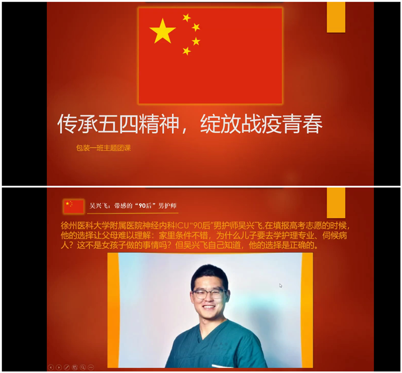 在此次团课中,各班主讲人提前准备宣讲材料,分别围绕“五四精神的核心”、“传承五四精神的重要性”和“如何发扬五四精神”几个方面展开。各班通过观看视频、主题演讲和分享感悟等多种形式,学习在此次抗击疫情过程中 “90后”援鄂医疗队队员的先进事迹,号召大家作为当代先进青年的代表,要应当承担起对于国家、社会的责任与使命,在疫情防控中,做一些力所能及的工作,让青春在战疫中绽放。