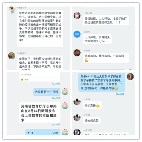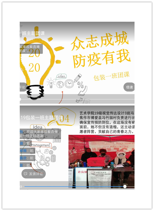 在此次团课活动中,各班在团支书的带领下重点学习了郑邦山厅长14日新闻发布会讲话、校学生会“停课不停学”倡议书的内容以及青年大学习第一期。团课开始前,各班团支书精心准备PPT,通过线上直播、分享感悟、交流讨论等形式,普及防控知识、理性科学防疫。各班主讲人号召大家要按照 “停课不停学”的要求,积极利用线上平台进行学习和讨论交流,不要因疫情而荒废学业,践行我校优良的学风。最后,各班重点学习了郑邦山厅长14日新闻发布会讲话内容,大家纷纷表示,在这次疫情中受到了一次思想的洗礼,不仅感动于那些在一线奋战的医护人员,更深刻感受到了全国人民众志成城抗击疫情的决心和努力。作为青年学子,会时刻响应国家号召,服从学校安排,利用线上资源进行学习,加强自身防护,做防控知识的传播者、疫情谣言的制止者和健康校园的守护者。