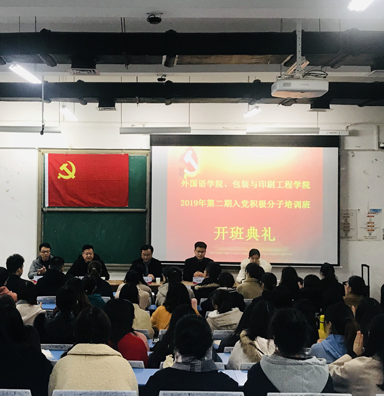 为进一步加强对入党积极分子的教育和培养,提高入党积极分子的政治思想素质和理论修养。11月26日,我院与外国语学院于合204教室联合举办2019年第二期入党积极分子开班典礼。外国语学院党委书记王明栓、包装印刷工程学院党委书记胡晓波、外国语学院正处级组织员潘胜寒及两个学院学工队伍老师出席典礼,两个学院近百名入党积极分子参会,开班典礼由段婧老师主持。