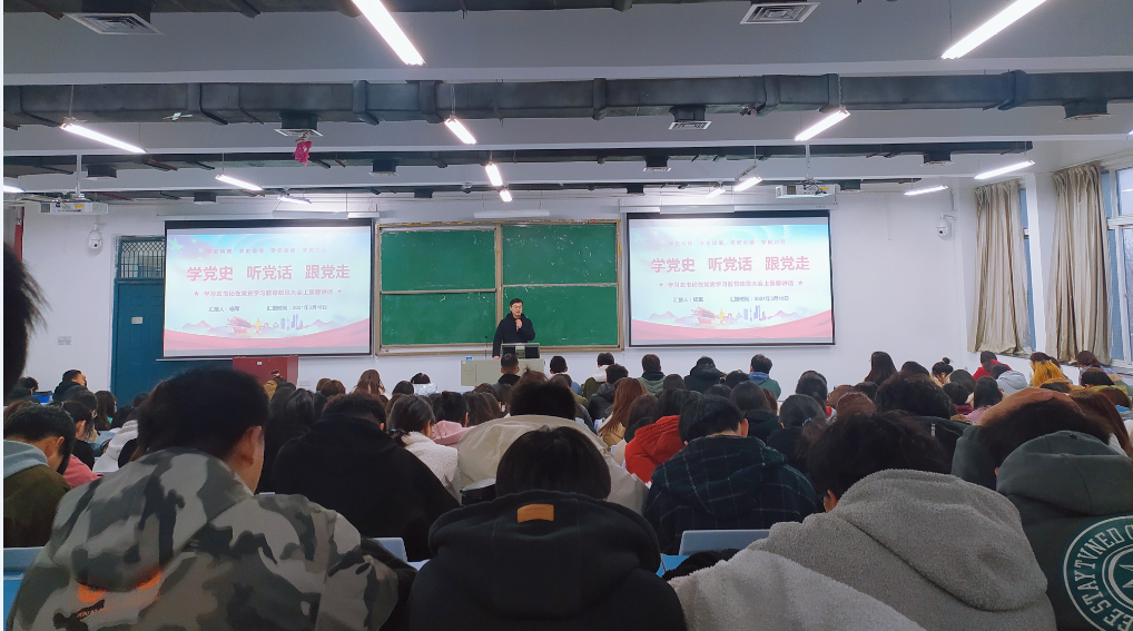 动员会后,杨军书记以《学党史、听党话、跟党走——学习习近平总书记在党史学习教育动员大会上重要讲话》为题讲授“开学思政第一课”。杨书记深入阐述了在中国共产党成立100周年之际,在全党开展党史学习教育,是党中央立足党的百年历史新起点、为动员全党全国满怀信心投身全面建设社会主义现代化国家而作出的重大决策。杨书记就开展好全院学生党史教育提出了四点要求:一是要提高政治展位,深入了解党史学习教育的重要意义;二是要以史为鉴,树立正确党史观,明确学习重点;三是要注重方式方法创新,取得实效;四是要切实为群众办实事解难题。最后,杨书记号召广大学生党员和青年学生要认真学习贯彻习近平总书记在党史学习教育动员大会上的重要讲话精神,做到学史明理、学史增信、学史崇德、学史力行,将党史学习教育作为一项重要政治任务抓紧抓实,不断提高政治判断力、政治领悟力、政治执行力,以优异成绩迎接建党一百周年。