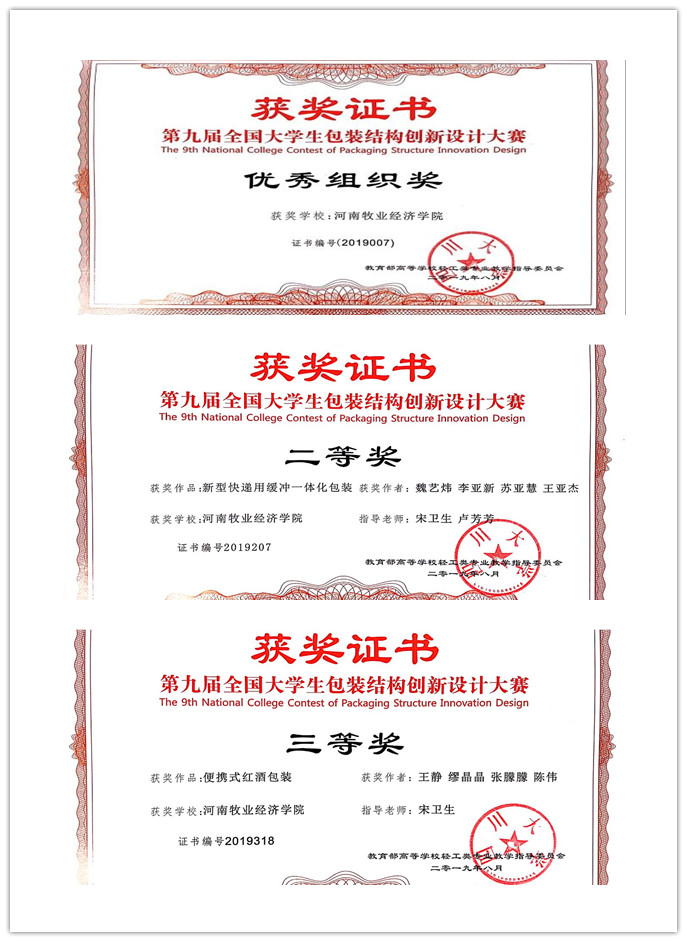 日前,第九届“全国大学生包装结构创新设计大赛”颁奖仪式在江南大学举行。经师生们认真筹备、积极应赛,我院参赛作品获二等奖、三等奖各一项,我校被授予“优秀组织奖”荣誉称号。