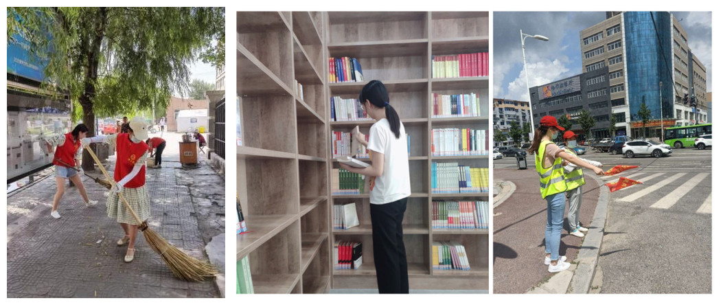 除此之外,我院志愿者还投身于便民利民服务,助环卫,减负担;扎身于图书馆,为书生正气;整盲道,行交通,为人们出行保驾护航;维秩序,共享单车摆放整齐,让城市更整洁;强宣传,向社区人员宣传讲解疫情期间为我国人民作出巨大贡献的医护人员和坚守在各行各业工作岗位上的人士们的典型光荣事迹,提升民族自豪感。