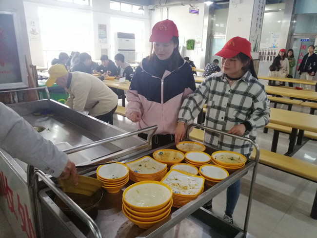 在此次志愿活动中,同学们的工作态度认真负责,一丝不苟,努力完成了各自的活动任务,为食堂阿姨减轻工作负担。