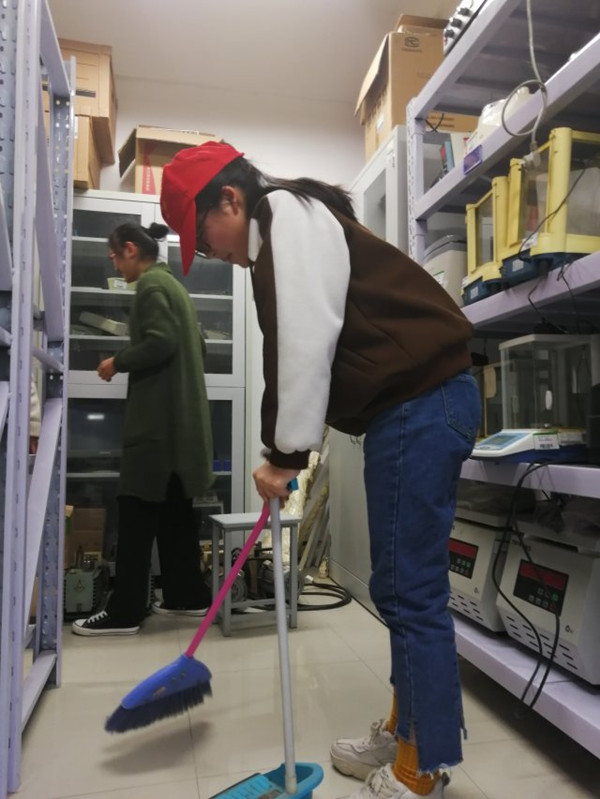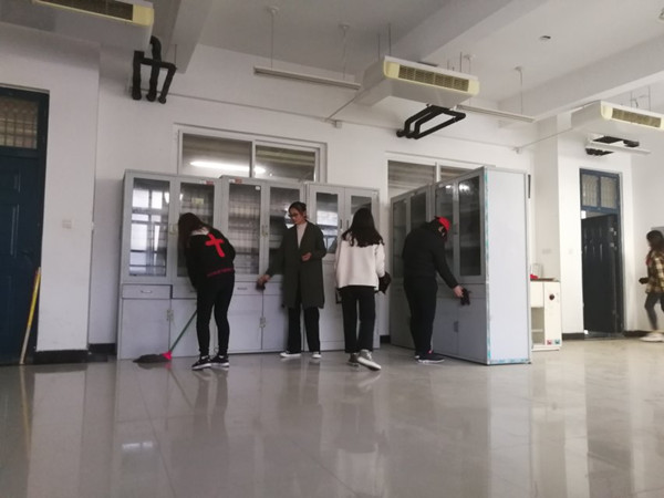 在实验室老师的安排和带领下,我院的志愿者们分成小组,有序投入到劳动之中。志愿者们对实验室进行彻底的清洁,将桌面、地面擦拭的干干净净,对地板与实验台的卫生死角进行了细致的清理。同时对各个实验室的实验器具进行分类整理,对于摆放不规范的实验用品进行了重新整理。在志愿者们将近两个小时的努力下,各个实验室的环境变得焕然一新。
