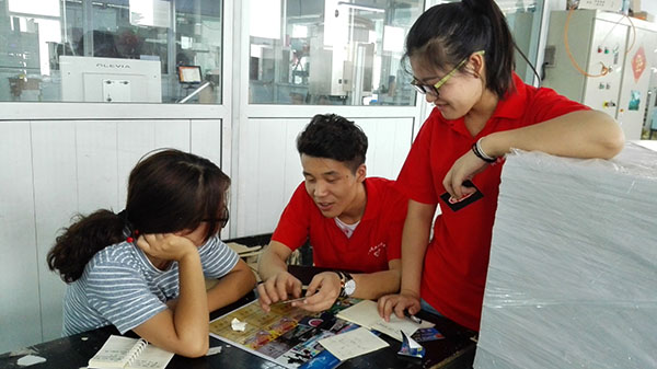 7月7日,客服部的老师和生产部的老师带大家到不同的岗位上进行体验、实践,客服部的成员跟着老师学习到如何通过与客户协商解决问题,生产部的同学分别跟各位老师参与并学会了PVC工艺流程中的贴磁、检卡、打孔、上磁、打码等工作程序,车间的各位师傅为大家热心讲解,同学们也都认真学习、虚心求教,力求最短时间内掌握最牢固的基本知识技巧。