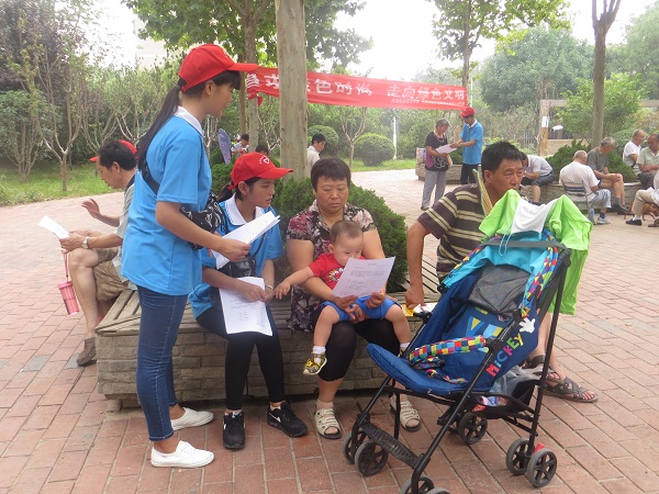在活动现场,热心的队员们悬挂出绿色环保主题条幅,并通过发放传单、知识问答等形式,广泛发动附近社区居民畅谈绿色话题,增强居民们的环保意识,营造绿色和谐氛围,来共建绿色、低碳社区。队员们向市民解说如何从身边小事做起,为环保贡献自己的一份力量。在活动当中,队员们还遇到我校李延庆老师,他饶有兴趣地和队员们聊起环保,对队员们发起的环保倡议大加赞同。队员们的活动,吸引了不少市民的热情参与,市民们纷纷表示要从自身做起,积极行动,保护环境、爱护家园。
