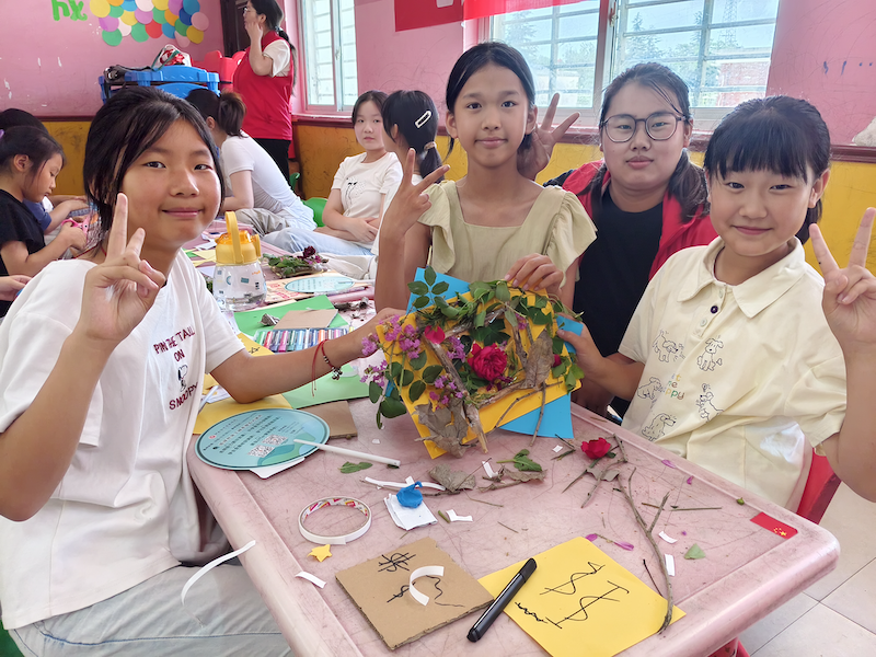 一声声清脆的“Good morning!”拉开了这场别开生面的英语课序幕。实践团成员们用绘本、图片和趣味互动引导孩子们学习“兴趣爱好”相关的英语词汇与拼写。课堂上,孩子们一张张稚嫩的笑脸,一声声响亮的跟读,让原本安静的教室充满了生机与活力。紧接着,队员们带来了一节别具创意的自然手工课《枯木迎春》。孩子们在实践团成员的指导下,拾起身边的树枝、鲜花、嫩草,用小手把普通的自然材料拼贴成一幅幅春意盎然的风景画。简单的材料,在孩子们的巧思下变得生动灵动,一件件承载童真与想象的作品,不仅装点了教室,也照亮了孩子们的心田。在最后的爱国主题课堂上,实践团成员带领孩子们一起动手剪纸,一个个小小的五角星在孩子们的巧手下诞生。大家把自己亲手剪出的五角星贴在大屏幕上的天安门图案周围,稚嫩却认真地装点祖国的象征性建筑。孩子们小心翼翼地贴、满怀自豪地看,稚嫩的心中也在这双手间播下了“我与祖国共成长”的种子。