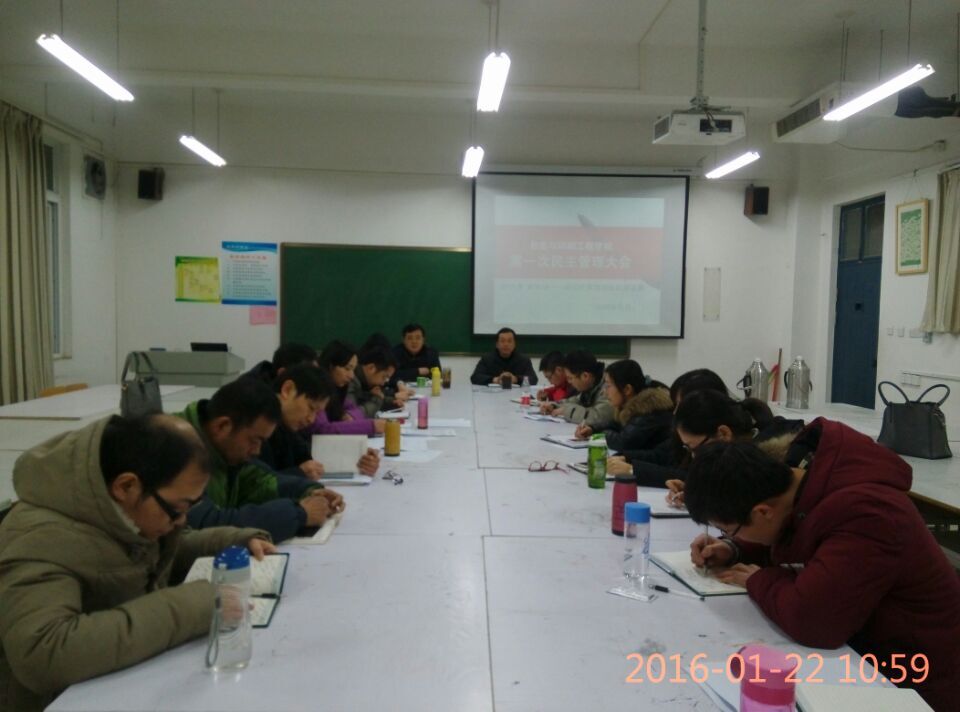 2016年1月22日上午,太阳集团城娱8722在龙子湖校区二号教学楼C225室召开第一次民主管理大会,会议由副书记聂莉主持,全院教师参会。