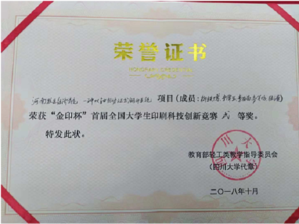 本届“金印杯”全国大学生印刷科技创新竞赛历时两个月,决赛环节分为本科及专科两个组分别进行,本科16组、专科6组,共产生一等奖4项、二等奖7项、三等奖11项。由我校太阳集团城娱8722苗红涛老师指导的,以柳轶博同学为项目负责人,李苗苗、李泽亚、赵笑怡、张漫同学为组员的项目《一种双轴自动钢印系统》,经过产品展示、评审老师提问、现场答辩等环节,最终从60多个项目中脱颖而出荣获二等奖。