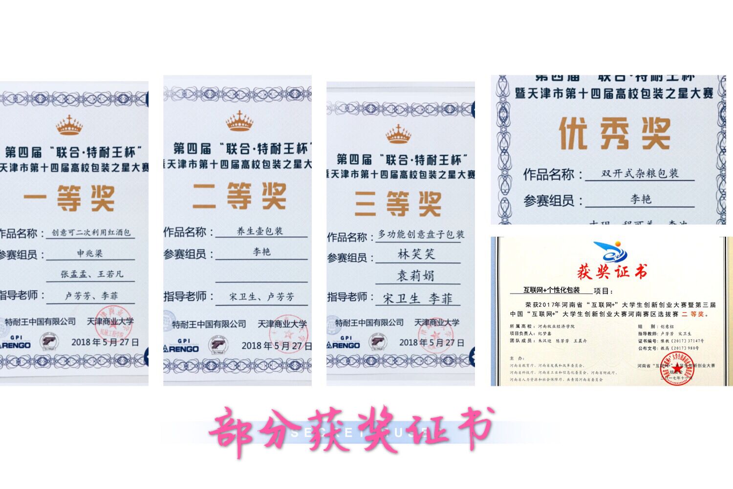——“创意可二次利用红酒包装”,获得第四届“特耐王杯”高校包装之星大赛一等奖,“养生壶包装”项目获得二等奖;多功能创意盘子包装、“一次成型陶瓷杯包装”、“防盗快递运输箱”项目获得三等奖,“双开式杂粮包装”等11个项目分获优秀奖。