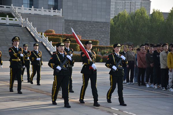 校国旗护卫队队员们迈着整齐划一、铿锵有力的步伐,护送鲜艳的五星红旗进场。行礼完毕,伴随着庄严的义勇军进行曲中,在所有人庄严的注视下,五星红旗冉冉升起,在晨曦的阳光中随风飘扬。在场师生集体向国旗行注目礼,表达对祖国无限的热爱和崇高的敬意