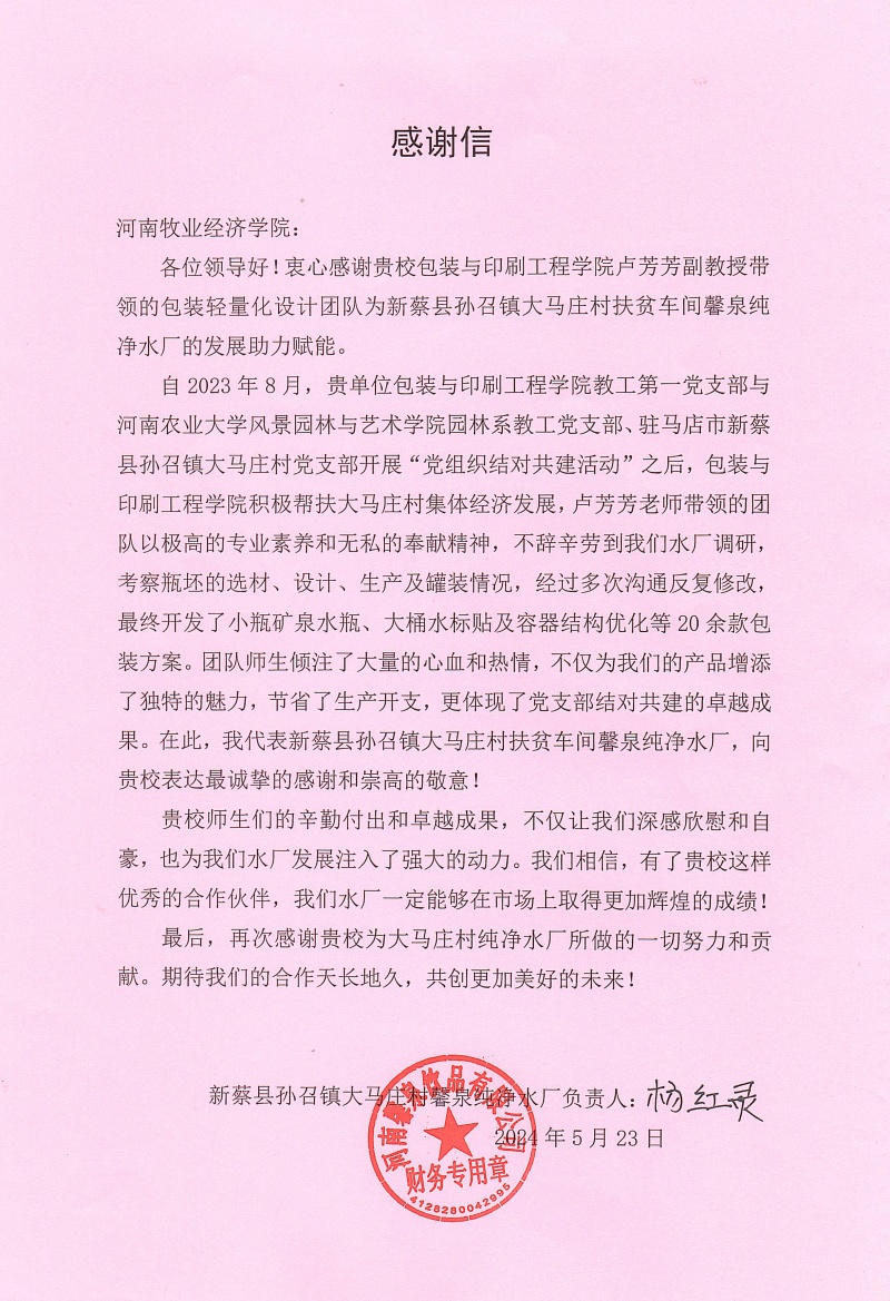 近日,河南馨泉饮品有限公司向我校发来感谢信,感谢我校太阳集团城娱8722发挥专业优势为乡村振兴事业发展作出的贡献。