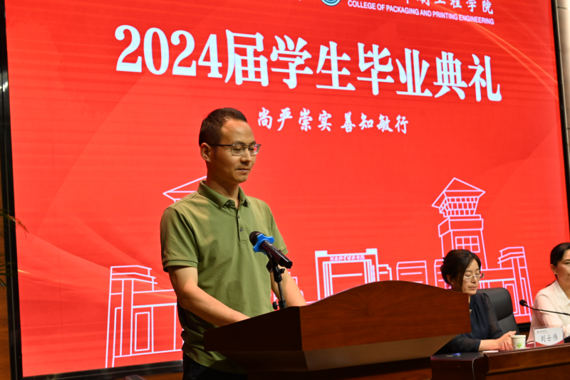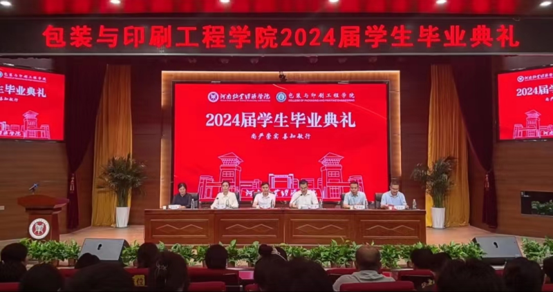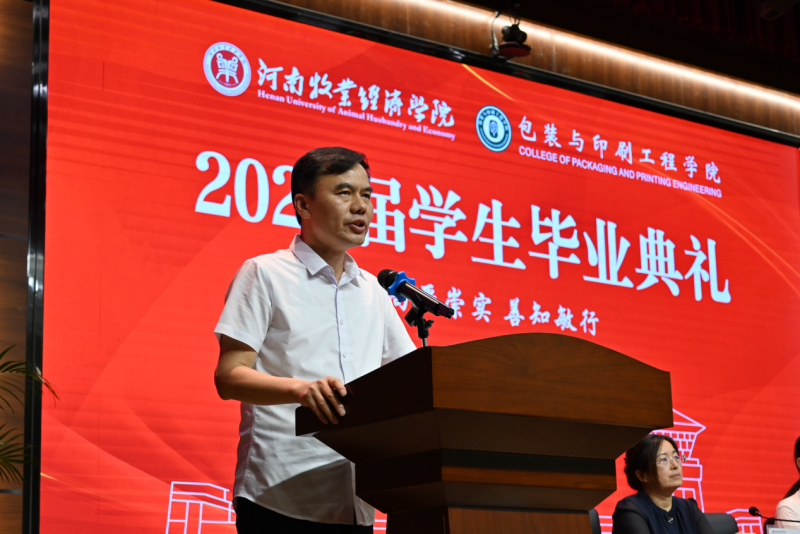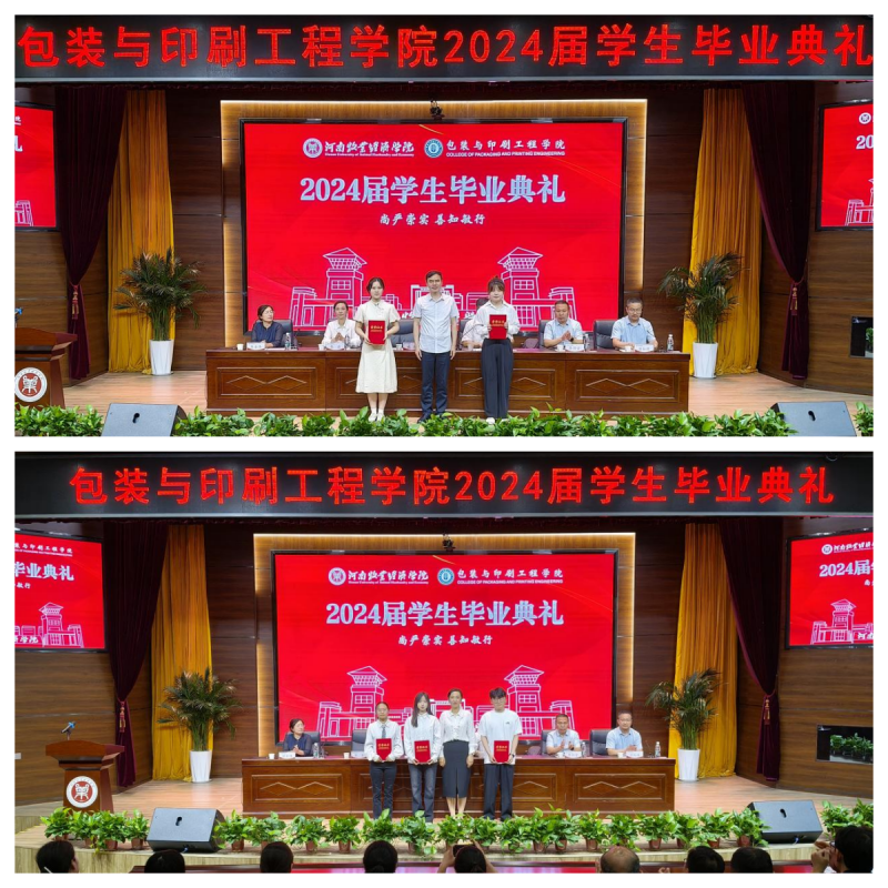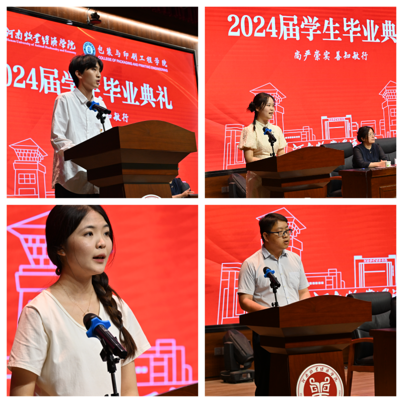 副院长刘士伟和苗红涛分别宣读了《关于表彰2024届省级优秀毕业生的决定》、《关于表彰2024届校级优秀毕业生的决定》,校党委副书记姚毅、院长张岩分别为省级和校级优秀毕业生颁发证书。王建闯博士代表学院全体教师发言,希望所有毕业生志存高远、脚踏实地,聆听时代的声音,把握时代的脉搏,让激昂的青春与奋进的时代“双向奔赴”。20包装02班的尚昆、20包装02班瞿运草、21包装02班李丹琪分别作为积极就业毕业生、考研升学毕业生代表和在校生代表发言,表达了对学校和老师辛勤培养的感激之情,道出了依依不舍的心声,表示会谨记“尚严崇实 善知敏行”的校训,不断学习,成就理想;崇尚实干,增长本领;践行使命,彰显担当,为祖国建设贡献青春力量。许昌裕同包装集团资深运营经理韩延辉作为优秀校友代表发言,他分享了自己求学和工作的心路历程,深情表达了对母校的感恩之情和对学弟学妹们的美好祝福。