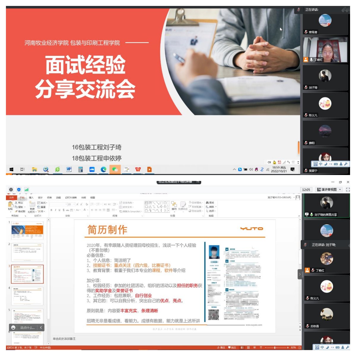 为扎实推进2023届毕业生就业工作,提升包装工程专业学生的就业竞争力,根据我院工作实际,结合学生需求,2022年10月20日、21日两天,我院联合弘雅书院共同开展包装工程专业“卓越计划”系列活动之“求职简历制作与面试技巧线上分享会”,本次分享会邀请了四名在包装知名企业工作的优秀校友介绍入职经验,2023届包装工程专业近百名学生参加会议,会议由包装工程教研室老师主持。
