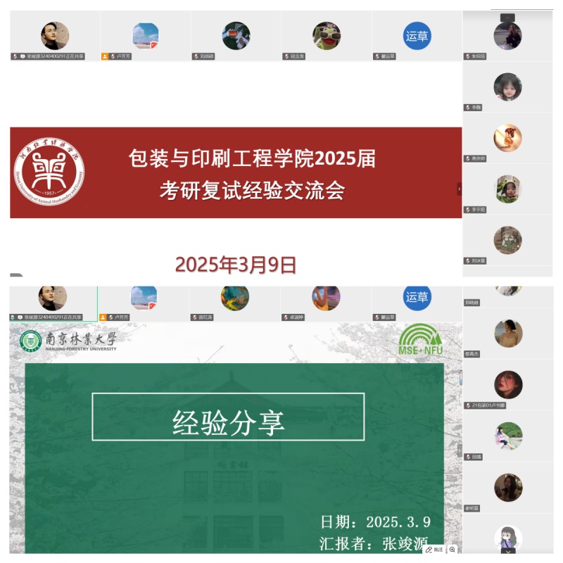 近日,全国研究生入学考试成绩陆续公布。为助力考研毕业生更好地备战复试,提升复试成功率,拓宽未来发展空间,我院于3月9日在腾讯会议平台举办了2025届包装工程专业复试交流会。会议特邀五位成功考取研究生的优秀校友分享复试经验。太阳集团城娱8722副书记李帅堂、副院长苗红涛、团委书记段婧等莅临现场,2025届考研毕业生积极参与。会议由包装工程教研室主任卢芳芳主持。